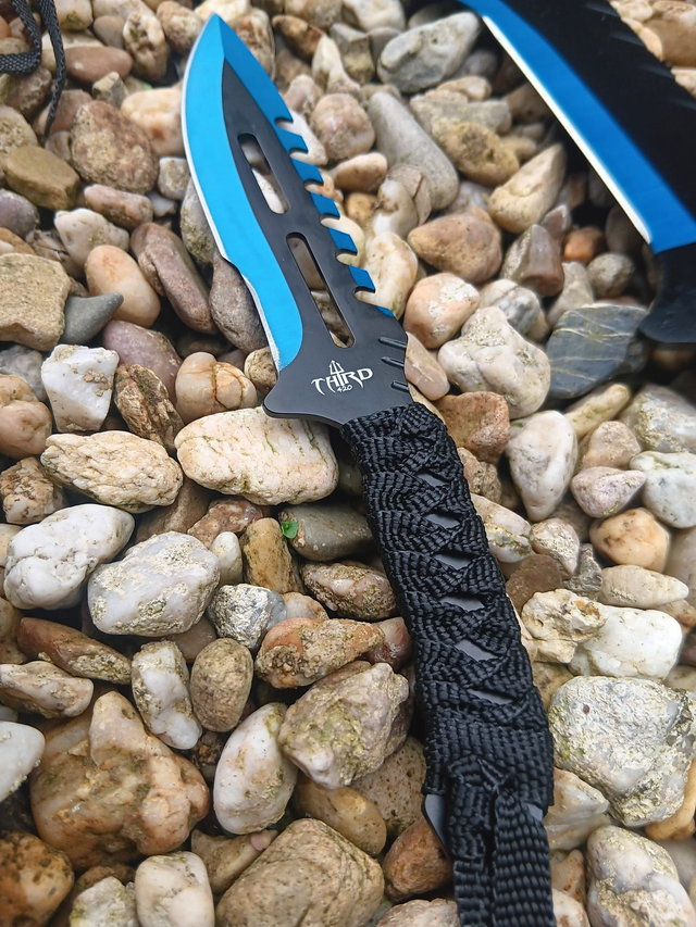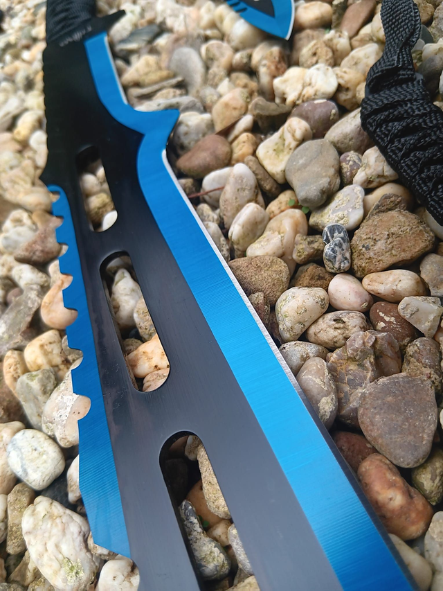 Das Set besteht aus einer 71,5 cm langen Machete und zwei 19 cm langen Wurfmessern aus hochwertigem 420 rostfreiem Stahl. Die eloxierten blauen Klingen sorgen für eine markante Optik, während nylonband-umwickelte Griffe sicheren Halt und komfortable Handhabung bieten.