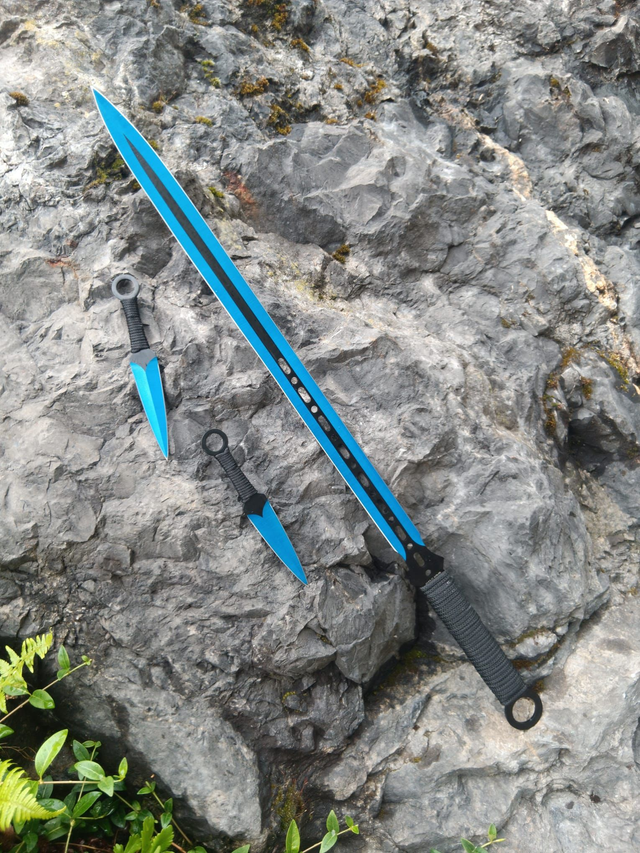 Das Set besteht aus einer 68 cm langen Machete und zwei 16,3 cm langen Wurfmessern aus hochwertigem 420 rostfreiem Stahl. Die eloxierten blauen Klingen sorgen für eine markante Optik, während nylonband-umwickelte Griffe sicheren Halt und komfortable Handhabung bieten.