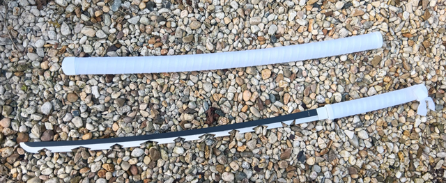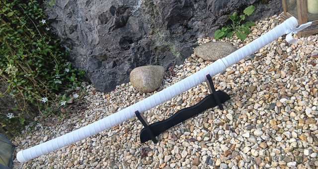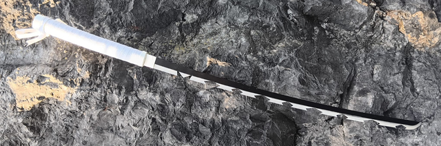 Daten: Gesamtlänge 101 cm, Klingenlänge 67,5 cm, Stärke 3,5 mm, Gewicht 900 g, Klingenmaterial 420er Stahl. Die Klinge besitzt scharfe Kanten und Spitzen und sorgt für eine authentische Optik.