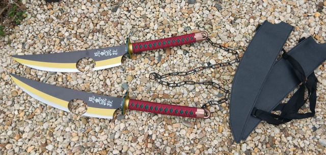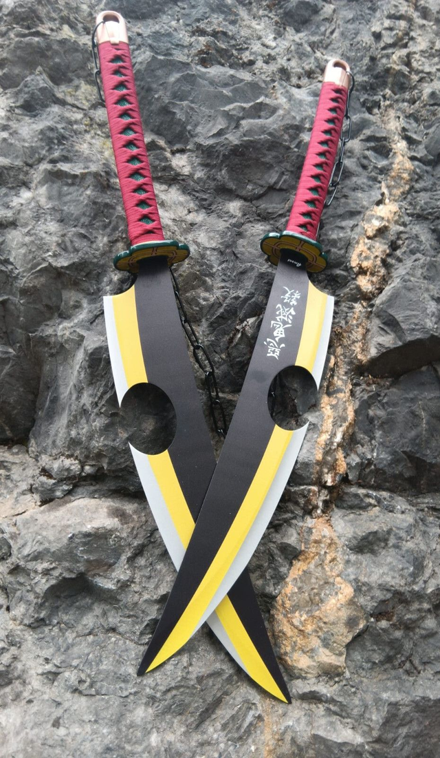 Tauchen Sie ein in die Welt von Demon Slayer mit diesen originalgetreuen Zwillings-Katanas im Stil von Tengen Uzui. Ideal als Sammlerstück, Geschenk oder für einen beeindruckenden Cosplay-Auftritt auf Conventions, zu Halloween oder Karneval.