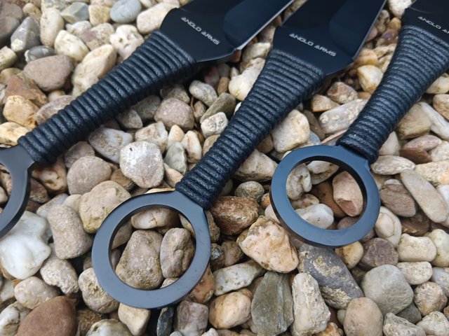 Die schwarzen Klingen aus 420 rostfreiem Stahl überzeugen durch Stabilität und Schärfe. Der mit schwarzem Paracord umwickelte Griff sorgt für eine sichere, ausgewogene Handhabung. Gesamtlänge von 30,5cm je Messer, Klingenlänge 18cm und ein Gewicht von 141g. Das robuste Nylon-Holster ermöglicht sicheren Transport.