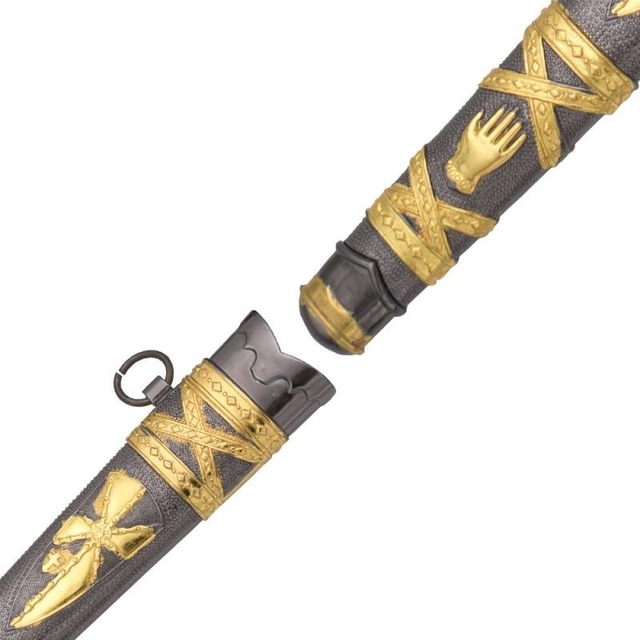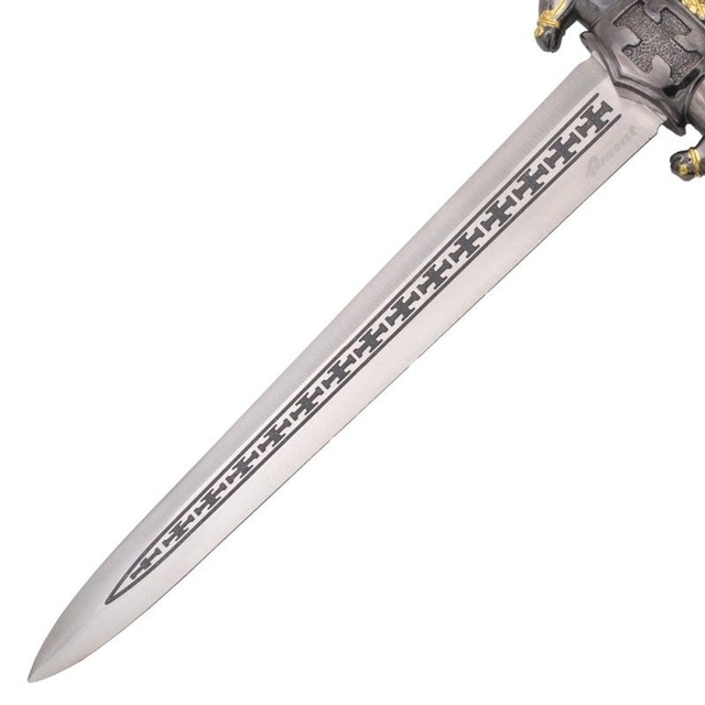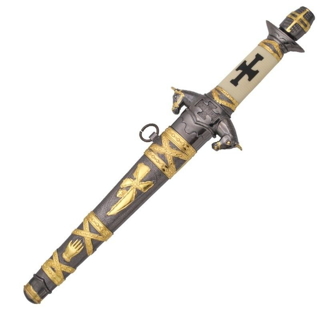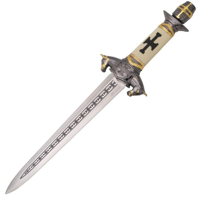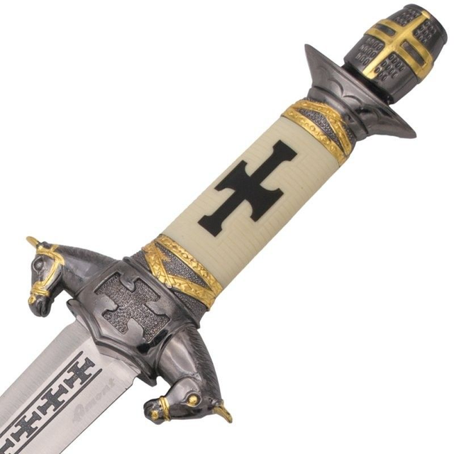 Tauchen Sie ein in die Welt des Mittelalters mit diesem beeindruckenden Ritterdolch. Der elfenbeinfarbene Griff mit schwarzem Kreuz symbolisiert Tapferkeit und Ehre. Die nickelfarbene Scheide mit goldenen Akzenten unterstreicht das edle Design. Jedes Detail erinnert an vergangene Schlachten und heldenhafte Zeiten.