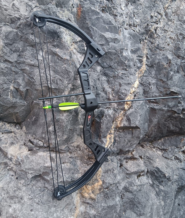 Der schwarze Compoundbogen besteht aus Fiberglas und ist für Rechts-