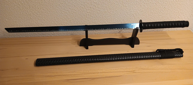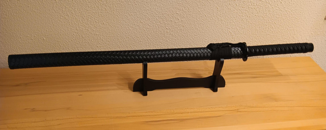 Das dekorative Katana verfügt über einen schwarz besaiteten Griff mit Tsuba sowie eine Holzscheide mit schwarzem Kunstlederbezug und zusätzlicher Wickelung. Inkl. Präsentationsständer.