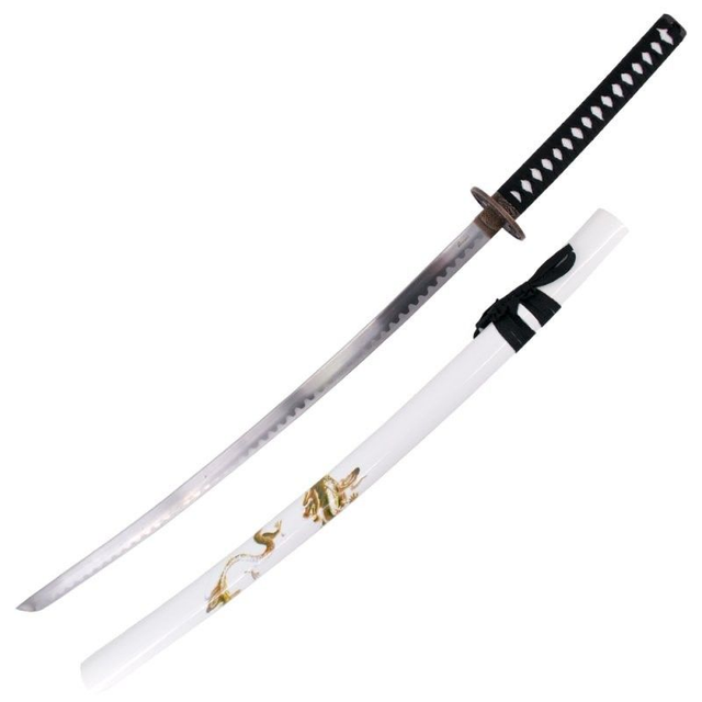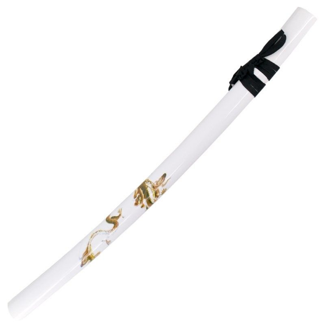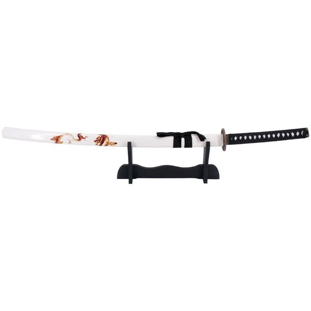 Entdecken Sie das elegante weiße Drachen Katana Schwert mit hochwertiger Carbonstahl Klinge und edler weißer Schwertscheide mit Drachenverzierung. Inklusive schwarzem Schwertständer für die perfekte Präsentation.