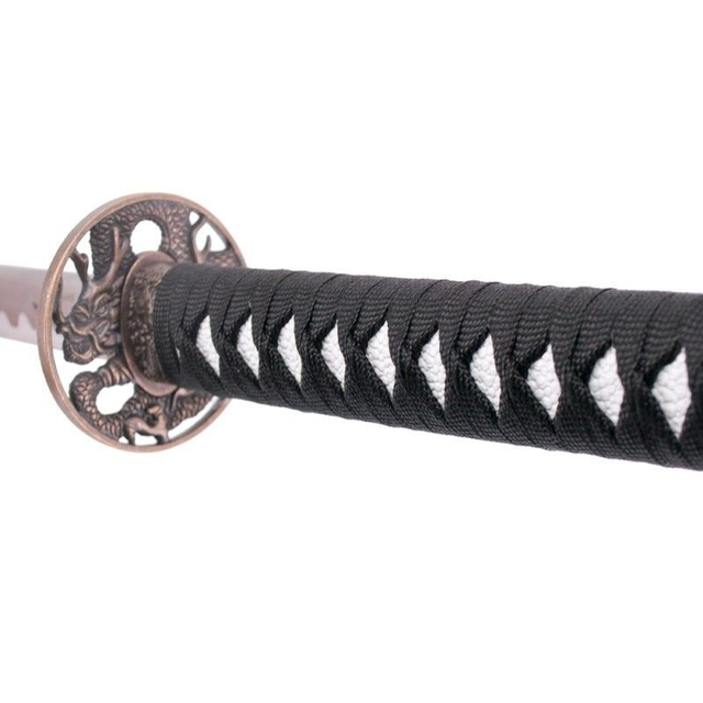 Dieses exklusive Samurai Katana ist ideal als Dekoration für Zuhause oder Büro und begeistert Sammler sowie Liebhaber der fernöstlichen Kultur. Die kupferfarbene Tsuba mit Drachenmotiv und der schwarz besaitete Griff mit Rochenhaut-Optik sorgen für einen authentischen Look.