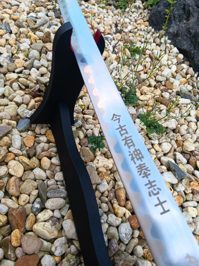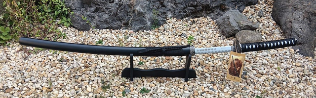 Entdecken Sie das elegante schwarze Katana Schwert im The Last Samurai Stil mit edler Carbonstahl Klinge und stilvoller schwarzer Schwertscheide mit Schriftzeichen. Inklusive schwarzem Schwertständer für die perfekte Präsentation Ihrer Samurai-Dekoration.